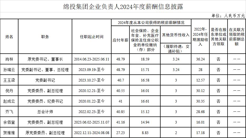 綿投集團2024年負責人薪酬和工資總額執(zhí)行情況