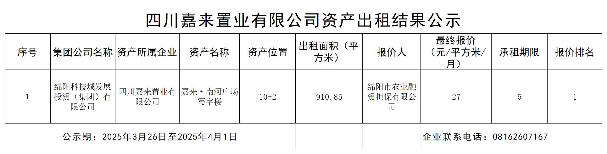 四川嘉來置業(yè)有限公司資產(chǎn)出租結(jié)果公示