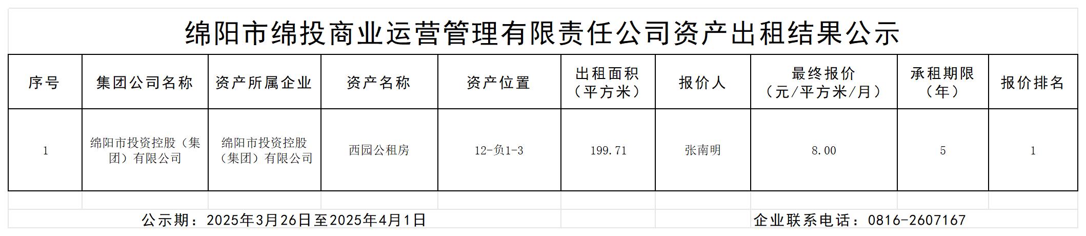 綿陽(yáng)市綿投商業(yè)運(yùn)營(yíng)管理有限責(zé)任公司資產(chǎn)出租結(jié)果的公示