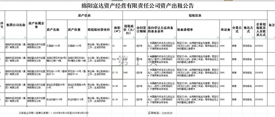 綿陽富達(dá)資產(chǎn)經(jīng)營(yíng)有限責(zé)任公司資產(chǎn)出租公告
