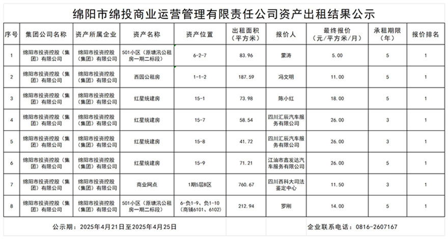 綿陽市綿投商業(yè)運營管理有限責(zé)任公司資產(chǎn)出租結(jié)果公示