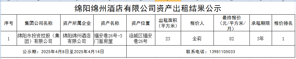 綿陽綿州酒店有限公司資產(chǎn)出租結果公示