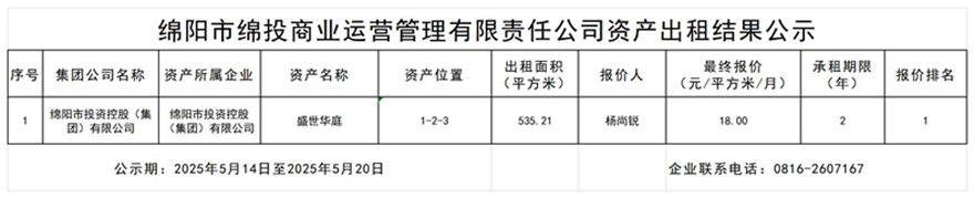 綿陽市綿投商業(yè)運(yùn)營管理有限責(zé)任公司資產(chǎn)出租結(jié)果公示