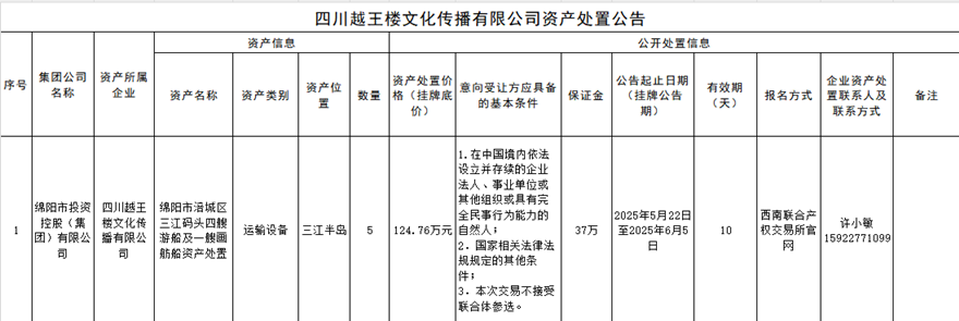 四川越王樓文化傳播有限公司資產(chǎn)處置公告
