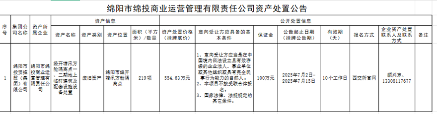 綿陽市綿投商業(yè)運營管理有限責(zé)任公司資產(chǎn)處置公告