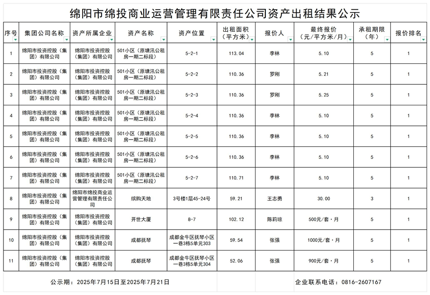 綿陽市綿投商業(yè)運營管理有限責(zé)任公司資產(chǎn)出租結(jié)果公示