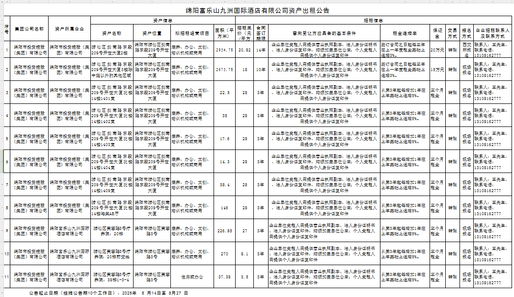 綿陽富樂山九洲國際酒店有限公司資產(chǎn)出租公告