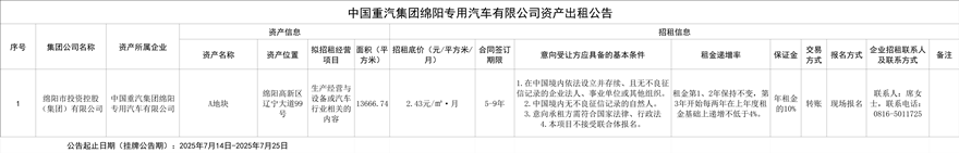 中國(guó)重汽集團(tuán)綿陽(yáng)專用汽車有限公司資產(chǎn)出租公告