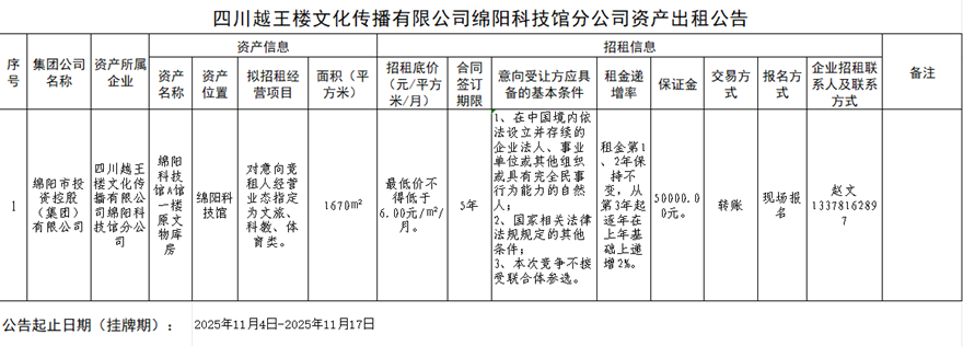 四川越王樓文化傳播有限公司綿陽(yáng)科技館分公司資產(chǎn)出租公告