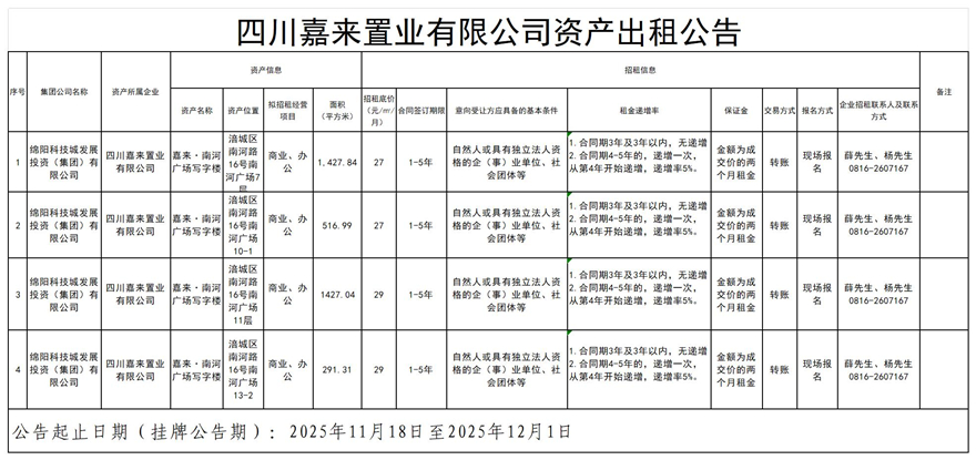 四川嘉來置業(yè)有限公司資產(chǎn)出租公告