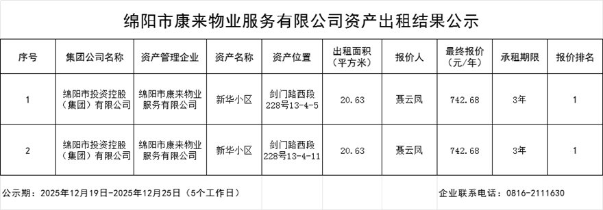 綿陽(yáng)市康來物業(yè)服務(wù)有限公司資產(chǎn)出租結(jié)果公示