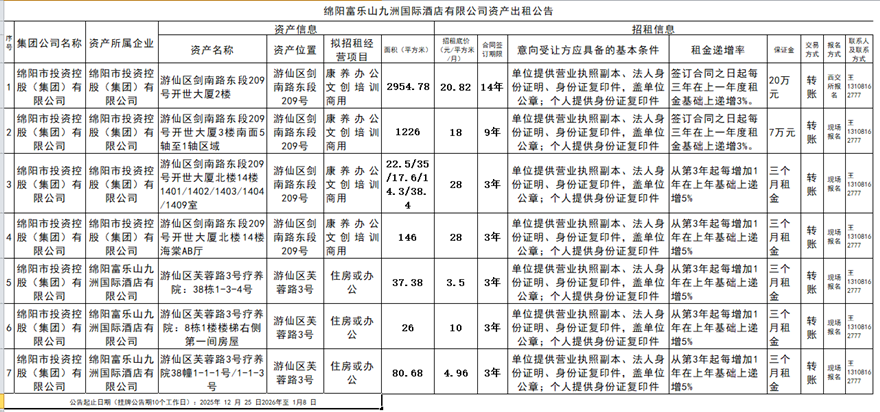 綿陽(yáng)富樂(lè)山九洲國(guó)際酒店有限公司資產(chǎn)出租公告