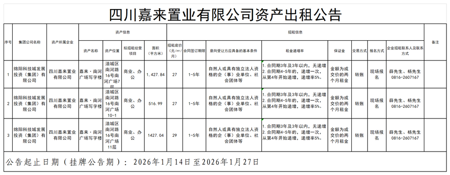 四川嘉來(lái)置業(yè)有限公司資產(chǎn)出租公告