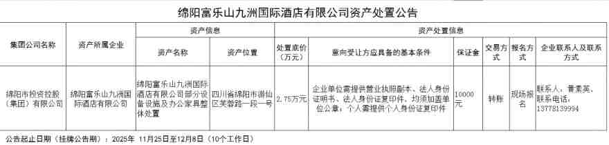 綿陽富樂山九洲國際酒店有限公司資產(chǎn)處置公告