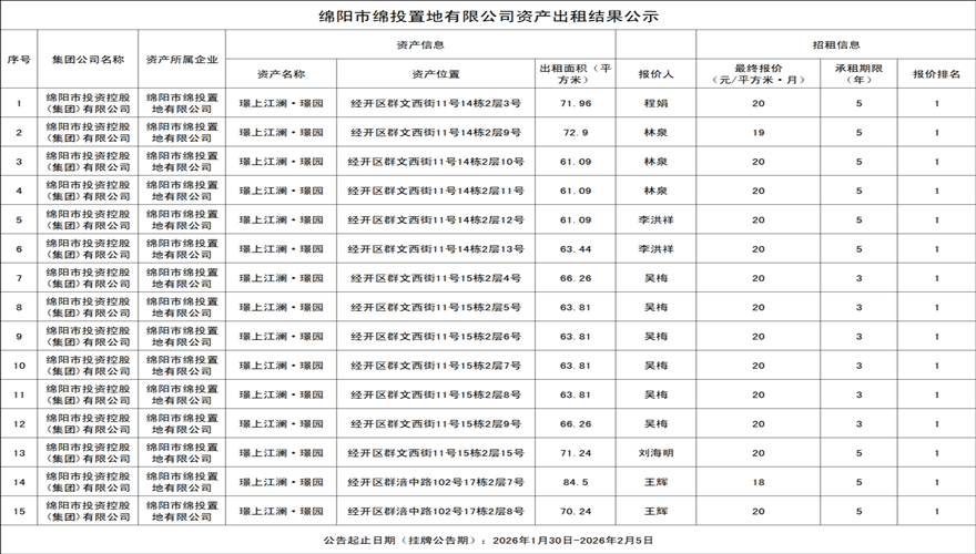 綿陽市綿投置地資產(chǎn)出租結(jié)果公示