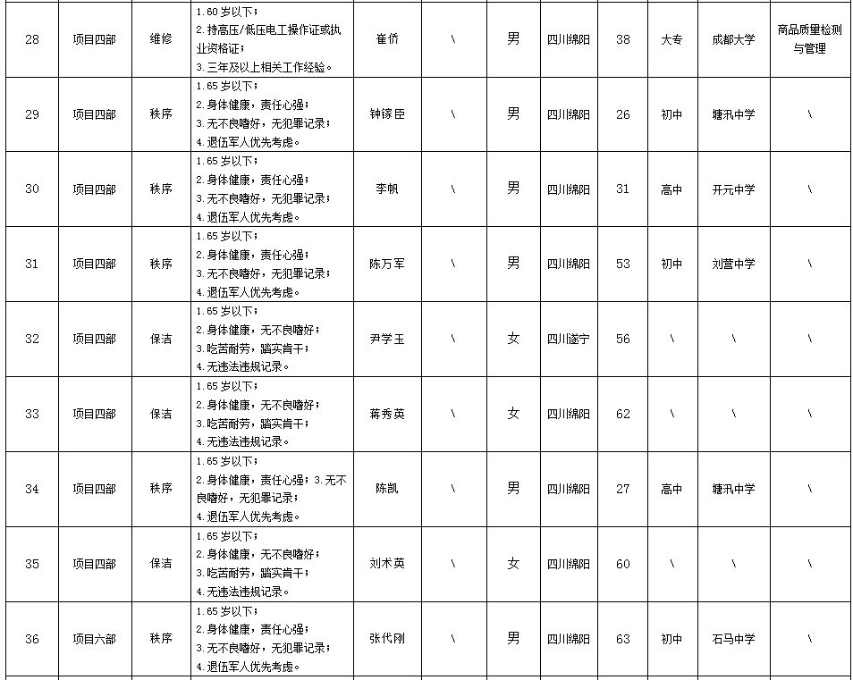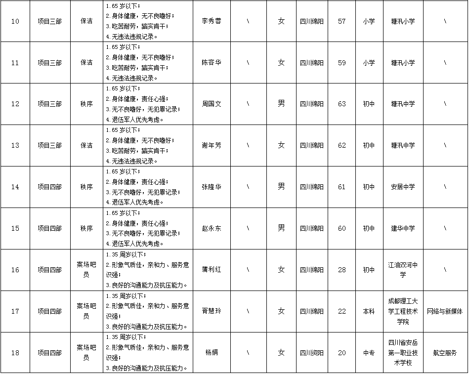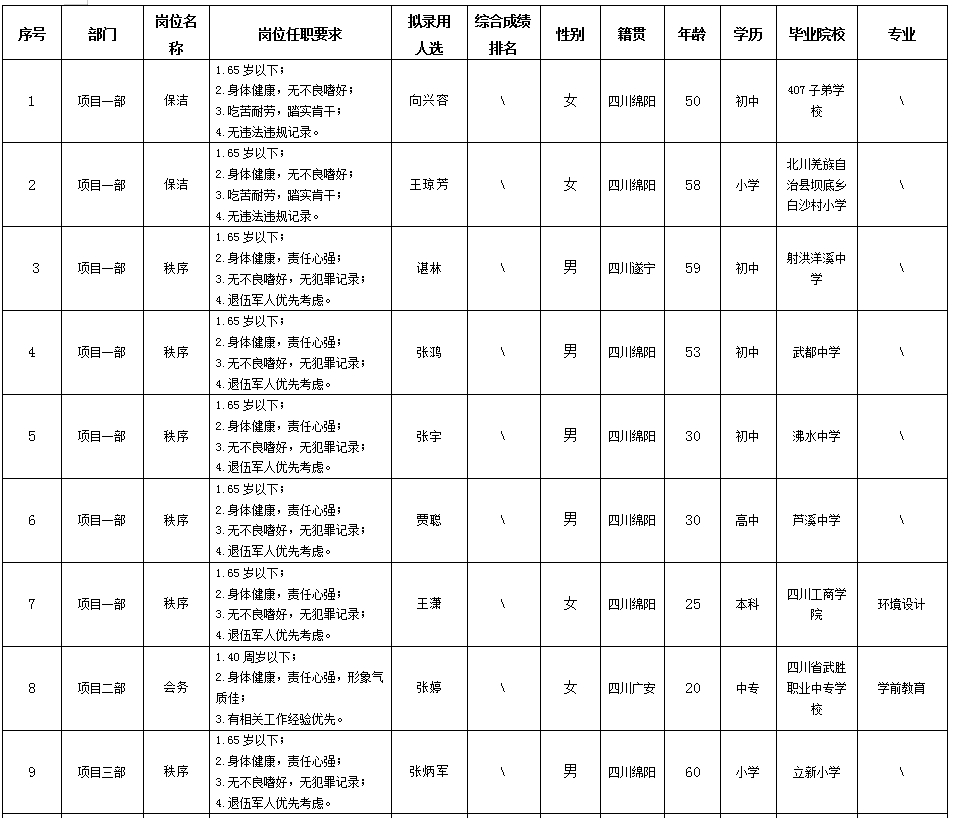 根據(jù)綿陽市康來物業(yè)服務有限公司發(fā)布的招聘公告及招聘相關規(guī)定,經(jīng)面試等程序,擬錄用向興容等同志到各項目部工作,現(xiàn)予以公示,具體情況如下: