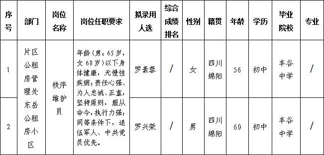 根據(jù)康居公司發(fā)布的長期招聘一線勤雜人員的招聘公告相關(guān)規(guī)定,經(jīng)面試、體檢等程序,擬錄用羅素蓉、羅興榮同志到綿陽市康居房產(chǎn)經(jīng)營管理有限公司片區(qū)公租房管理處東岳公租房小區(qū)工作,現(xiàn)予以公示,具體情況如下: