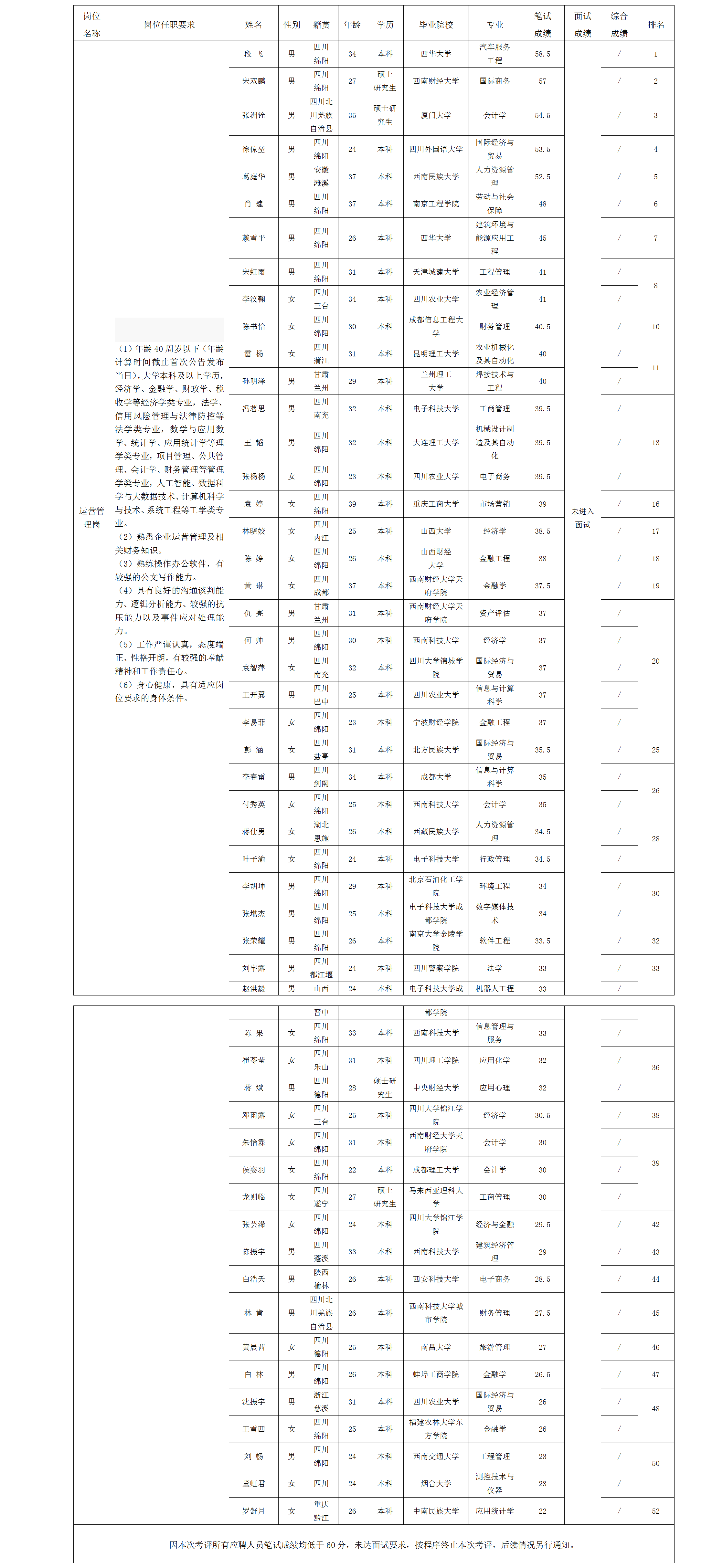 根據(jù)綿陽市投資控股(集團(tuán))有限公司發(fā)布的招聘公告及招聘相關(guān)規(guī)定,經(jīng)筆試、面試等程序,現(xiàn)將筆試(面試)成績予以公示。