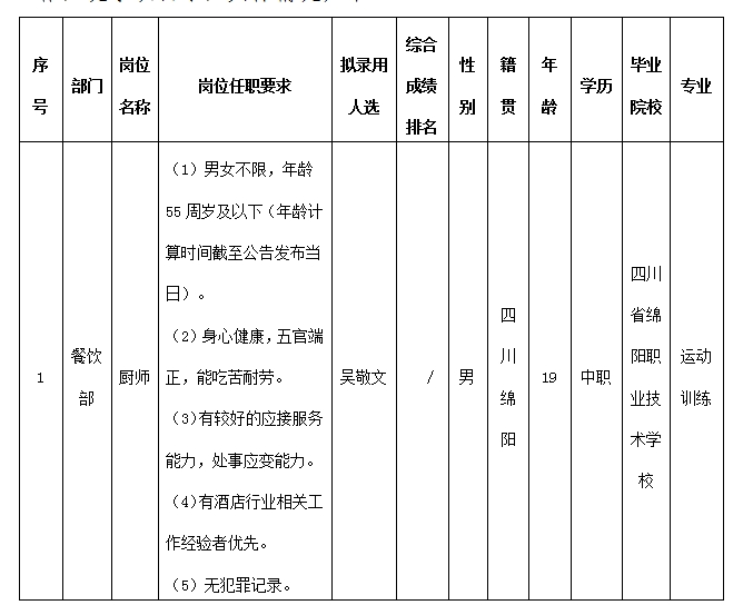 根據(jù)綿陽(yáng)市東津酒店管理有限責(zé)任公司發(fā)布的招聘公告及招聘相關(guān)規(guī)定,通過(guò)面試等程序,擬錄用吳敬文同志到餐飲部工作,現(xiàn)予以公示,具體情況如下: