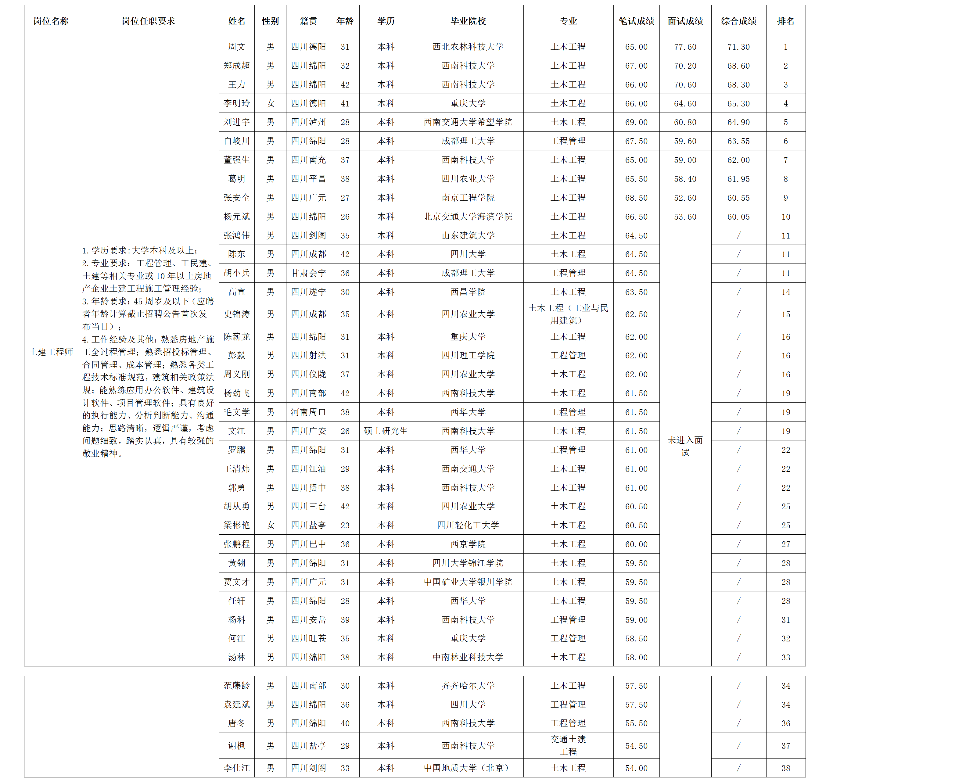【公開招聘】綿陽市綿投置地有限公司關于土建工程師崗位測試成績的公示