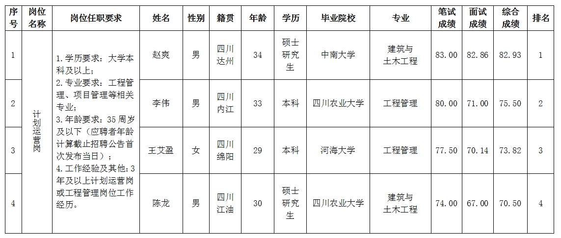 根據(jù)綿陽(yáng)市綿投置地有限公司發(fā)布的招聘公告及招聘相關(guān)規(guī)定,經(jīng)筆試、面試等程序,現(xiàn)將筆試、面試成績(jī)予以公示。