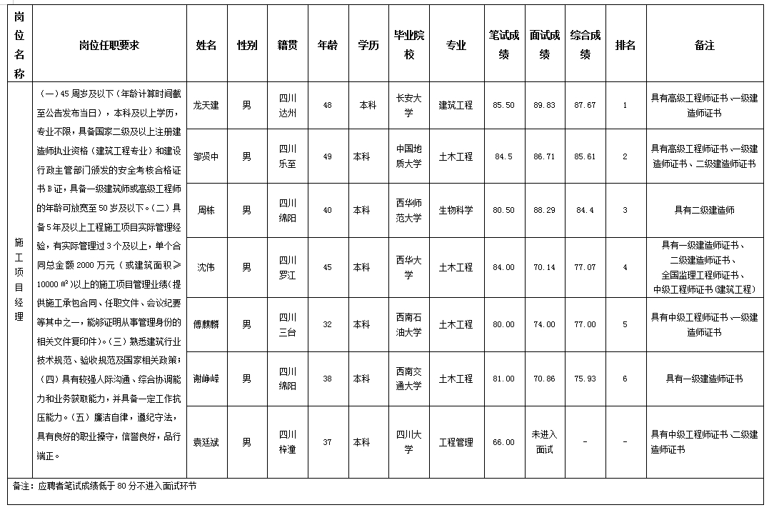 根據(jù)四川嘉來建筑工程有限公司發(fā)布的關(guān)于招聘施工項(xiàng)目經(jīng)理崗位的公告及招聘相關(guān)規(guī)定,經(jīng)筆試、面試等程序,現(xiàn)將筆試(面試)成績予以公示。