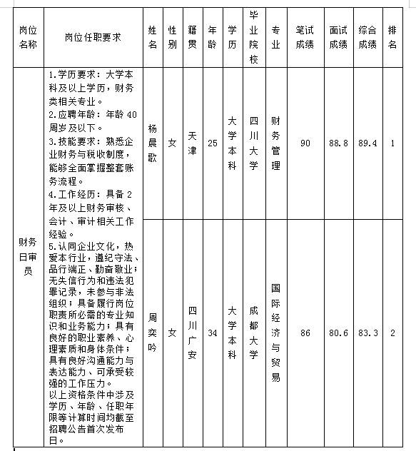 根據(jù)綿陽富樂山九洲國際酒店有限公司關(guān)于財務(wù)日審員招聘公告及招聘相關(guān)規(guī)定,經(jīng)筆試、面試等程序,現(xiàn)將招聘成績予以公示。