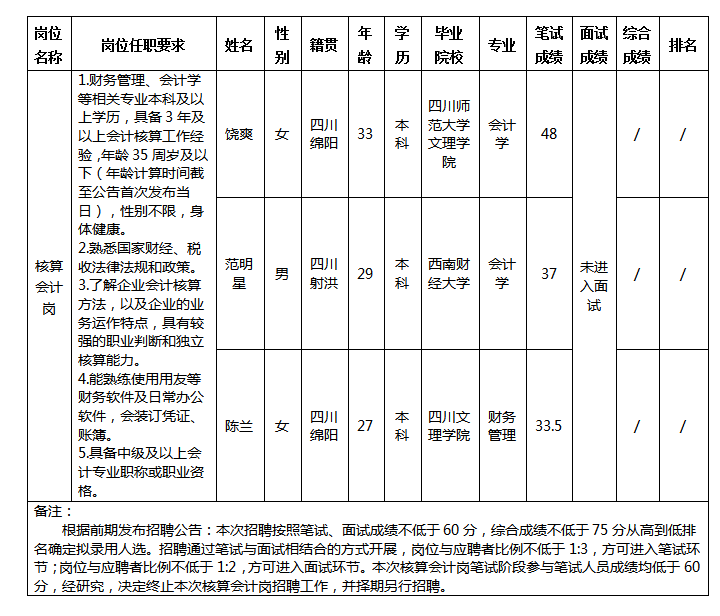 根據(jù)四川西津物流有限責任公司發(fā)布的招聘公告及招聘相關(guān)規(guī)定,經(jīng)筆試,現(xiàn)將筆試成績予以公示。