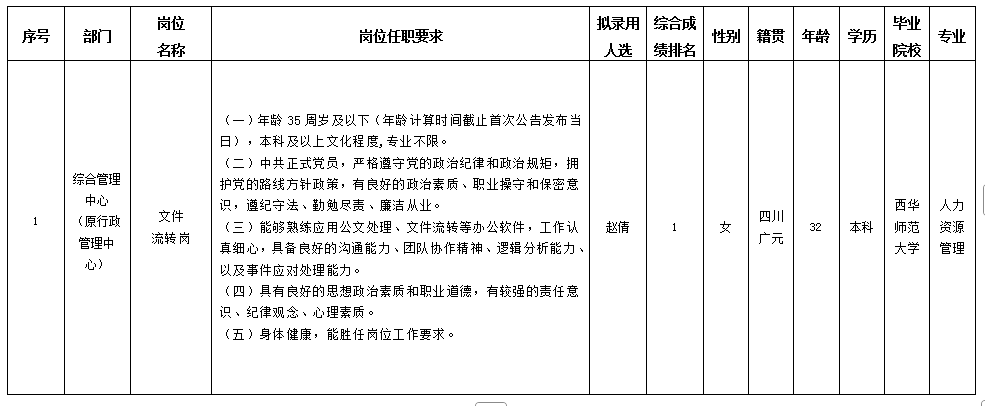 根據(jù)綿陽市投資控股(集團)有限公司發(fā)布的招聘公告及招聘相關(guān)規(guī)定,經(jīng)筆試、面試、背調(diào)等程序,擬錄用趙倩同志到綿陽市投資控股(集團)有限公司工作,現(xiàn)予以公示,具體情況如下: