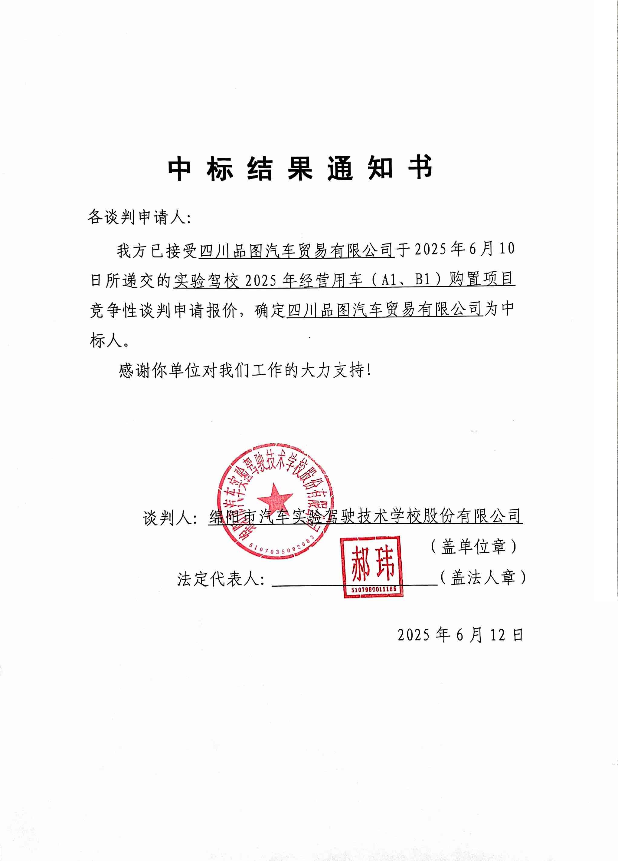 實(shí)驗(yàn)駕校2025年經(jīng)營(yíng)用車(chē)(A1、B1)購(gòu)置項(xiàng)目中標(biāo)結(jié)果通知