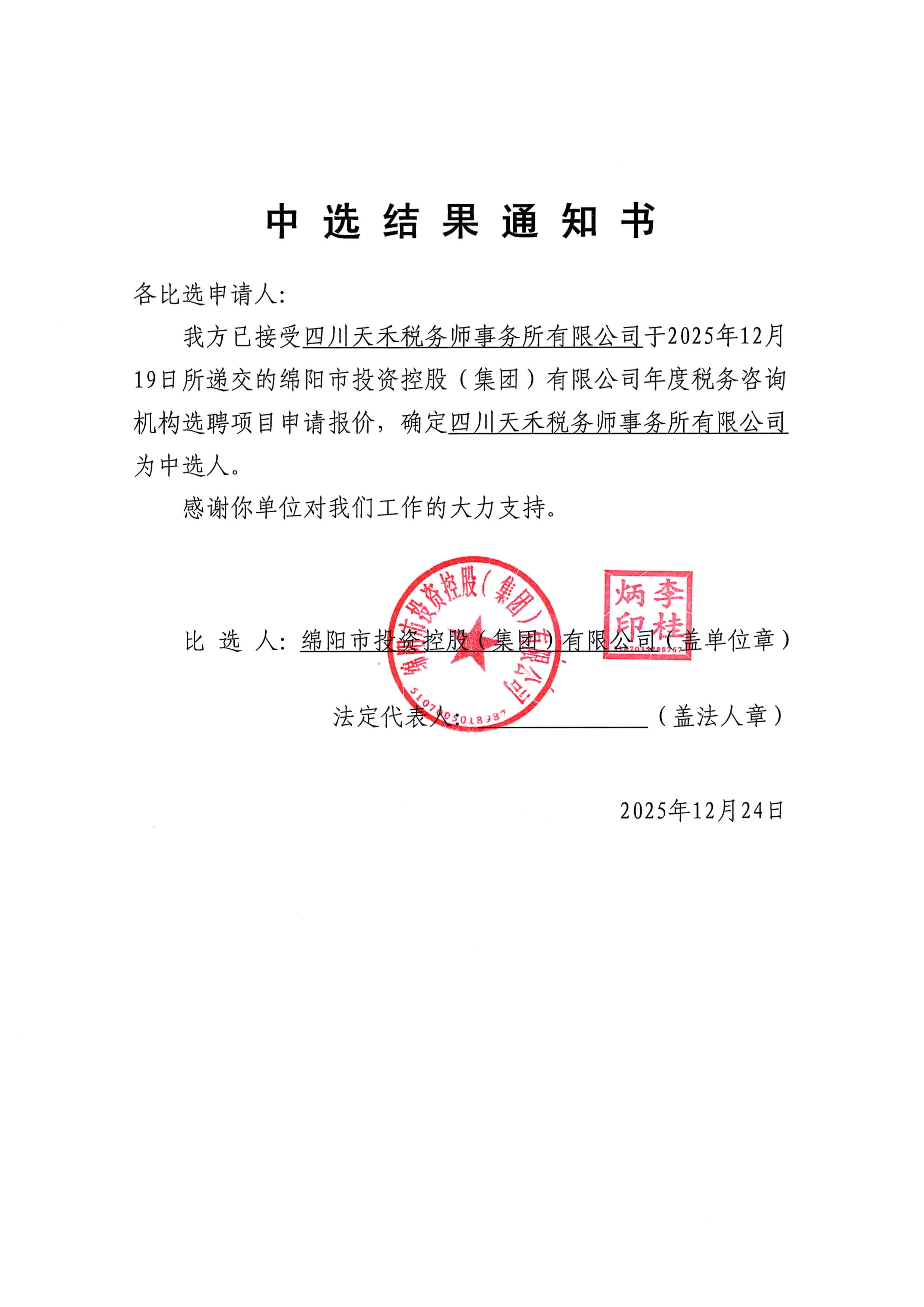 綿陽市投資控股(集團(tuán))有限公司年度稅務(wù)咨詢機構(gòu)選聘項目中選結(jié)果通知
